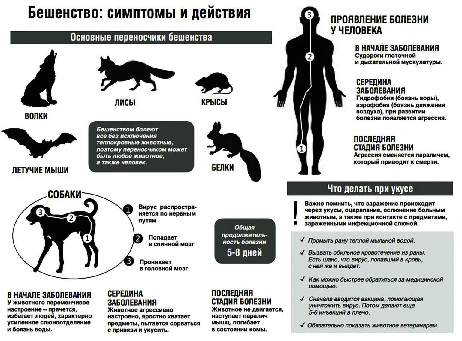 БЕШЕНСТВО (водобоязнь, гидрофобия) – это смертельно опасная болезнь, общая для животных и человека. Заражение происходит при контакте, при покусе больным животным или при попадании его слюны на поврежденную кожу или слизистые оболочки. Инкубационный период бешенства у собак> (скрытый) длится 3-6 недель. У щенков он занимает 5-7 дней. Часто скрытый период длится долго, у отдельных взрослых особей собак достигает одного года.